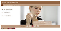 Der Kaffee-Profiler von JURA verrät Ihnen, welcher Kaffee-Typ Sie sind.Der mit Adobe Flash (bisher macromedia) realisierte Kaffee-Profiler evaluiert an Hand von bis zu fünf Fragen welchem Kaffee-Typ Sie entsprechen.